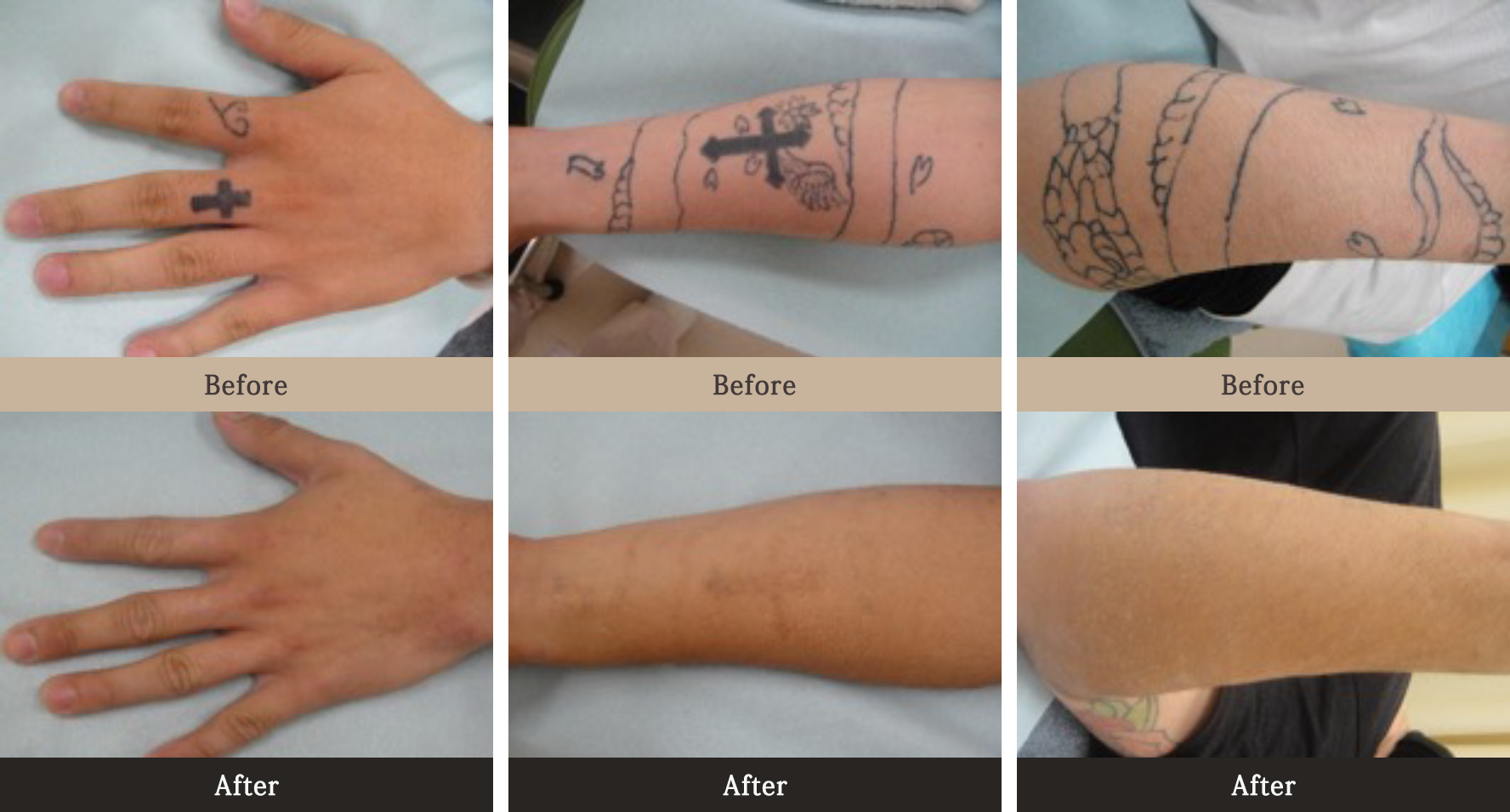 刺青(タトゥー)は簡単に消す事が難しく、傷跡や刺青(タトゥー)の存在感が残る場合もあります。傷跡は個人差もありますが、全くわからないというわけではありません。ワンタイムレーザーの場合はやけど後のような傷跡が残ります。月日が経つごとに、次第に目立たなくなります。