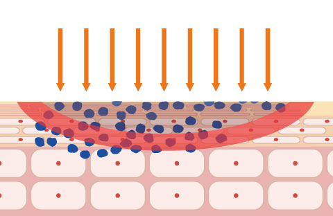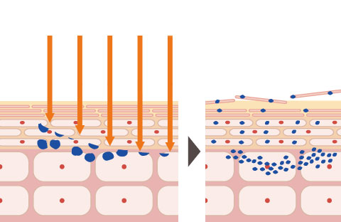 ピコレーザーで真皮層に残っている色素(刺青)に照射します。周囲の皮膚を傷つける事なく、色素細胞に反応します。従来のレーザーに比べ色素粒子をより細かく分解します。細かく破砕された色素は代謝排泄されます。